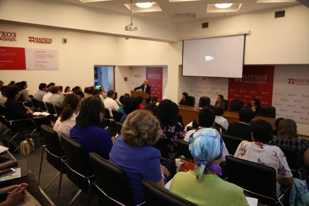 Программа мероприятия также включала лекцию Эндрю Вахтеля «Тенденции развития в сфере высшего образования в постсоветских странах». В течение 40 минут Вахтель рассказал об актуальных проблемах высшего образования и поделился опытом с коллегами из Казахстана. Слова Эндрю Вахтеля о том, что сейчас, когда есть Интернет, с помощью которого человек может найти любую информацию, неприемлемо просто передавать знания, как это было в СССР, что нужно учить студентов совершенно по-другому, заставили задуматься и задать вопросы гостю многих профессоров из Казахстана. Послушать лекцию пришли преподаватели не только университета Нархоз, но и других учебных заведений города Алматы, они изъявили также желание посетить АУЦА.